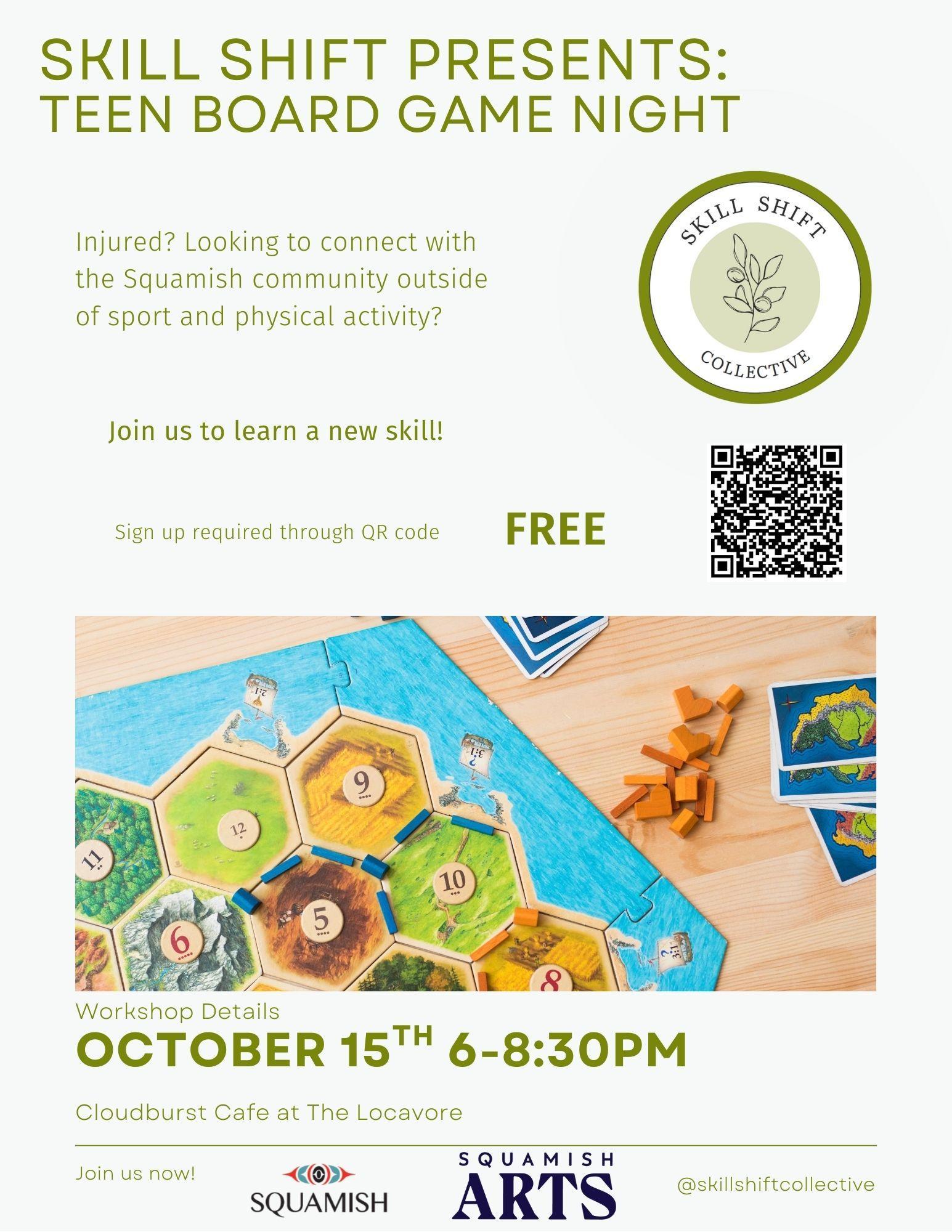 Emma is from a local not for profit called the Skill Shift Collective (https://www.instagram.com/skillshiftcollective/?hl=en). They have been putting on monthly events for people dealing with injury or feeling isolated in Squamish for the last 2 years. On October 15th they are putting on a teen board game night at Cloudburst Cafe at the Locavore and would like to invite any teens that may be interested. Parents/caregivers are also welcome to come along and support.