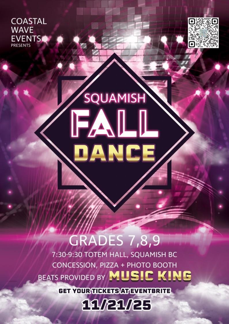 On November 21st, Coastal Wave Events is hosting the “Squamish Fall Dance” for grades 7, 8, & 9 at the Totem Hall from 7:30 - 9:30. Please see the attached flyer for more information.